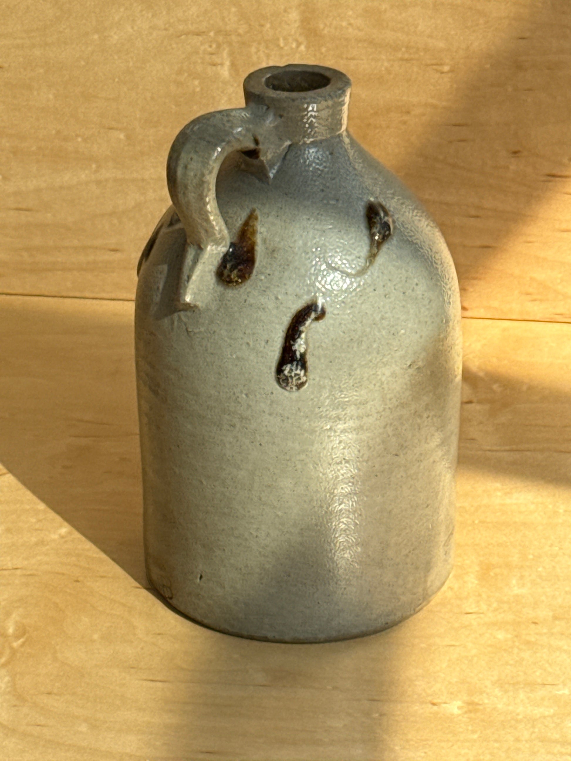 Beige/grey stoneware jug with swirls in black. 6”D x 10” T