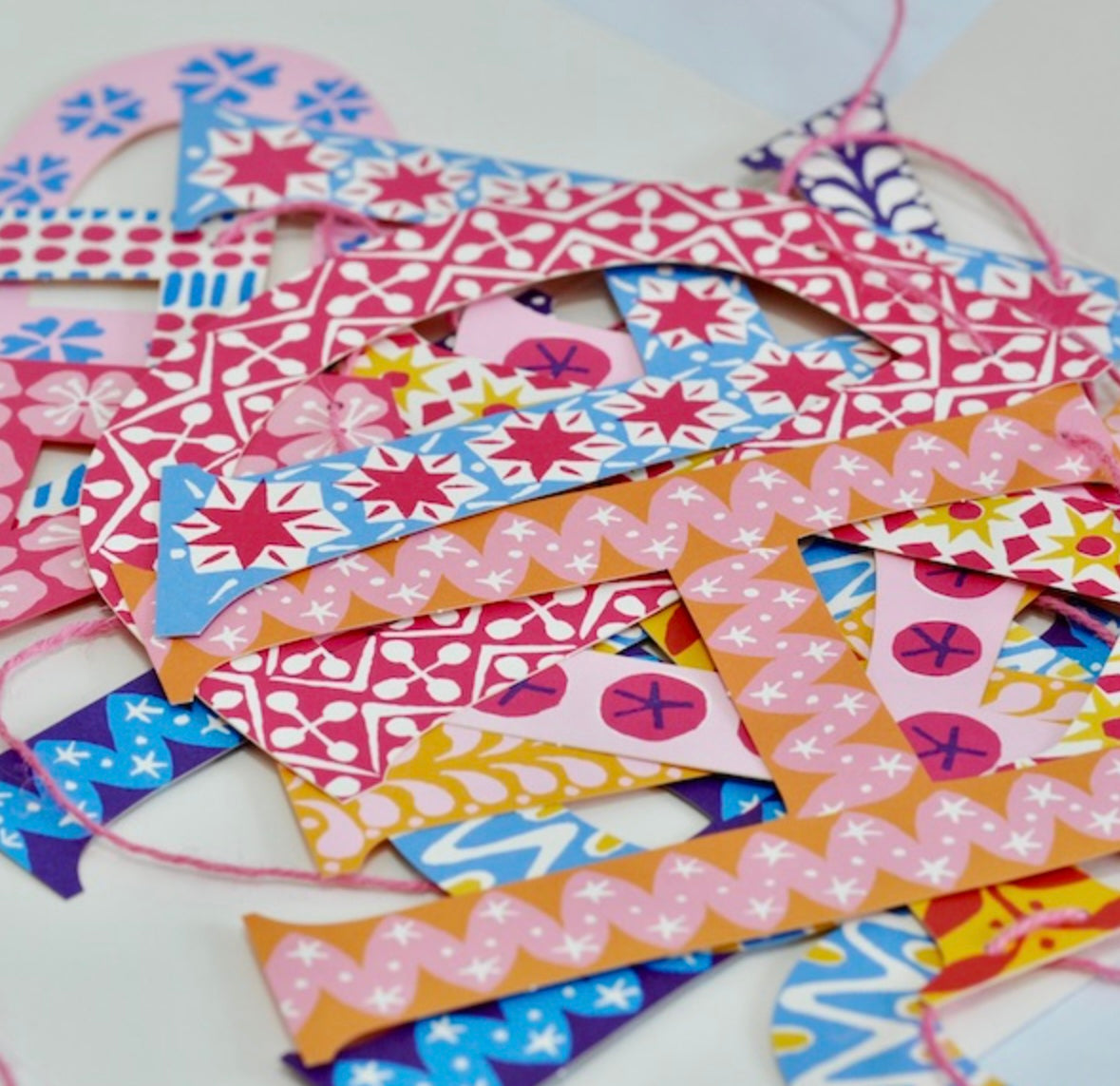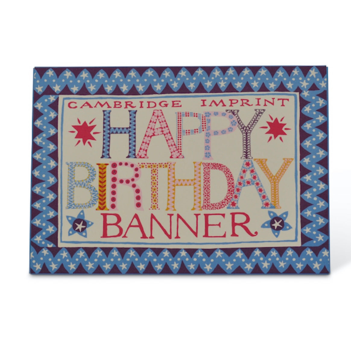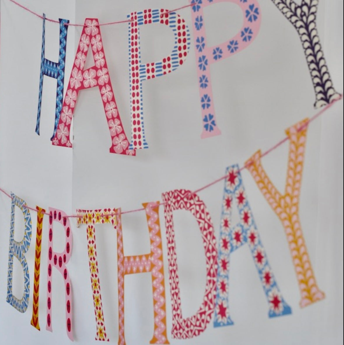 Thirteen large double-sided patterned card letters which spell out HAPPY BIRTHDAY. The letters are in assorted colours and designs, all with a strong folk art aesthetic, contained in a self-closing card wallet for long term storage. String together on yarn or ribbon of your choice. The letters are a generous 7.25” tall and the garland makes a dramatic decorative feature. Makes approximately 6-9 feet of garland, depending on how closely the letters are strung together. Thread is not included. Made in England from 300 gsm matte, uncoated responsibly sourced card, printed with vegetable oil-based ink in hand-mixed colours. There is no glue, plastic or metal in the banner itself or its packaging: the entire product is fully biodegradable and recyclable.