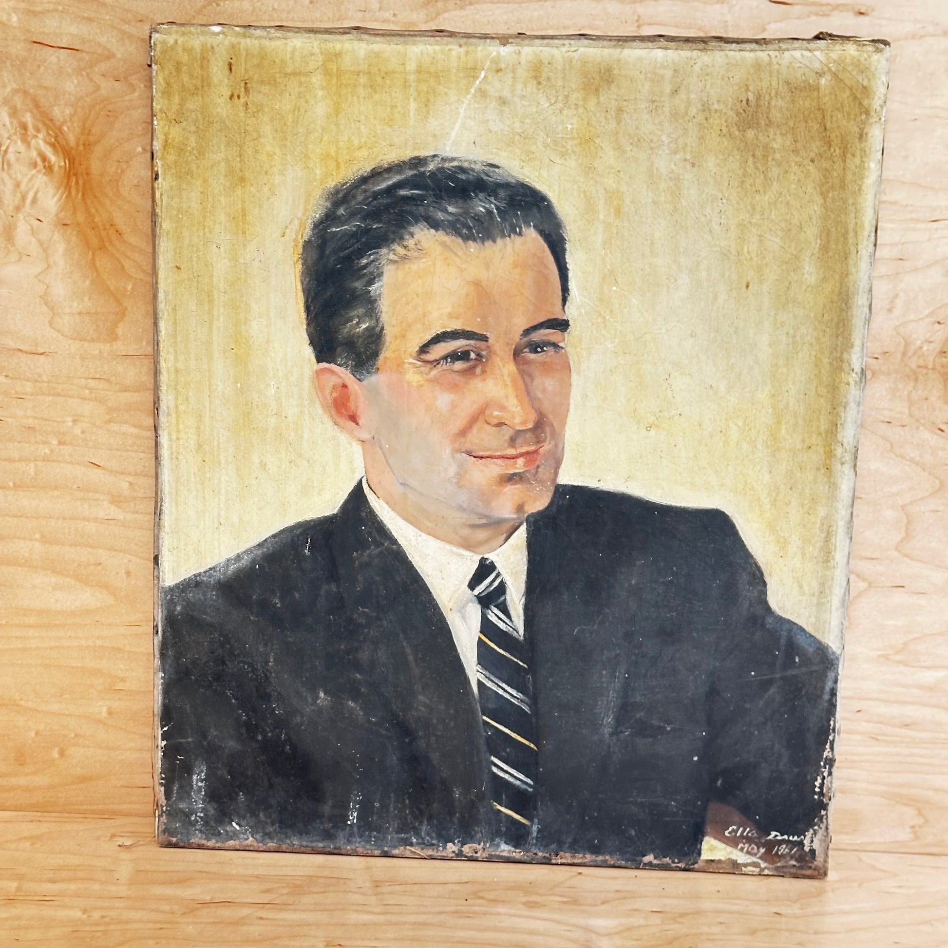 Vintage portrait of a man. He looks like a Mad Man! Signed Ella ?Daus?, 1961. Looks to be oil, on canvas. Some deterioration and discoloration of canvas at edges. 24"x 20”
