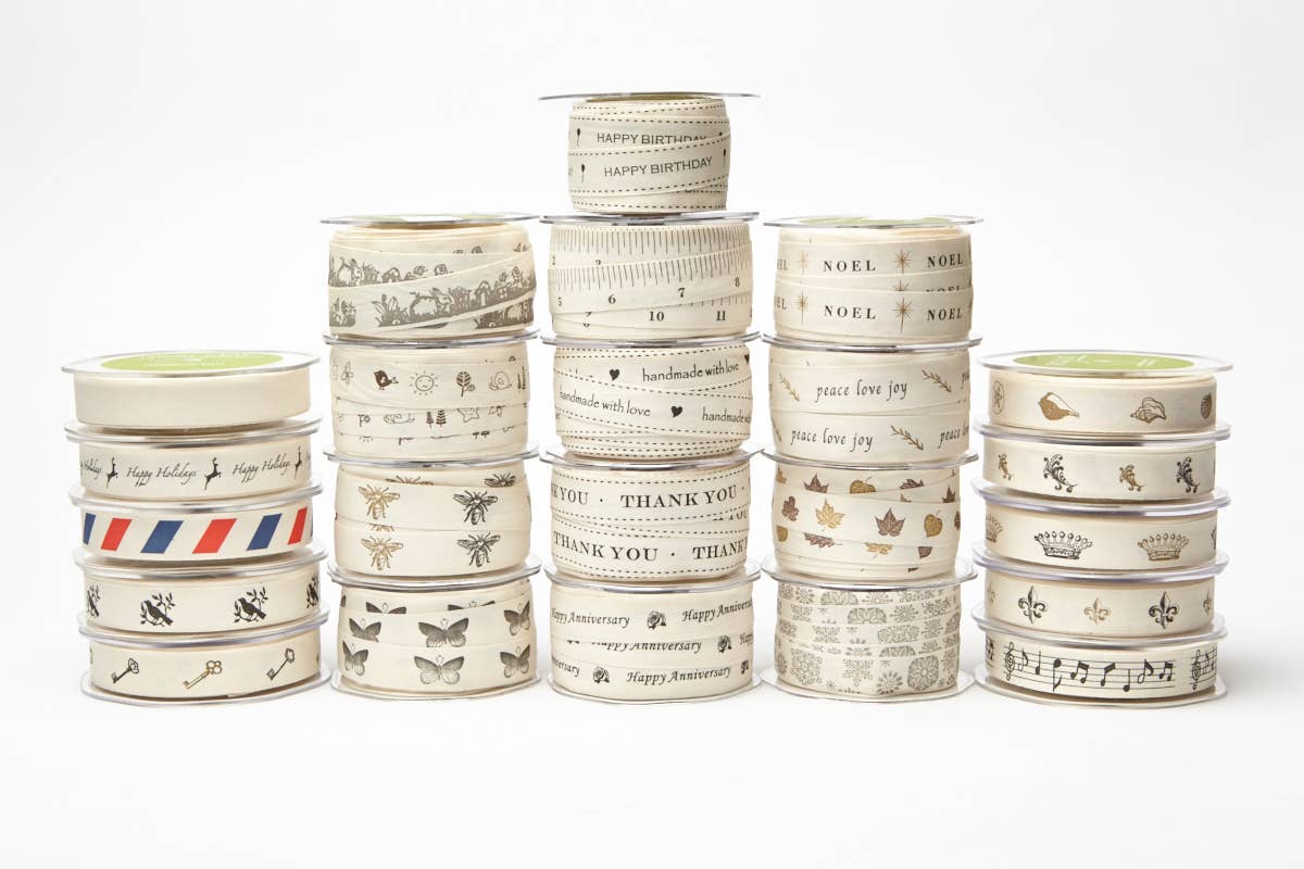 This 3/4 inch by 30 yard ivory canvas ribbon is printed with a repeating pattern. This ribbon makes a great addition to a personalized gift or gift bags, on floral arrangements, or on any store gift wrap.
