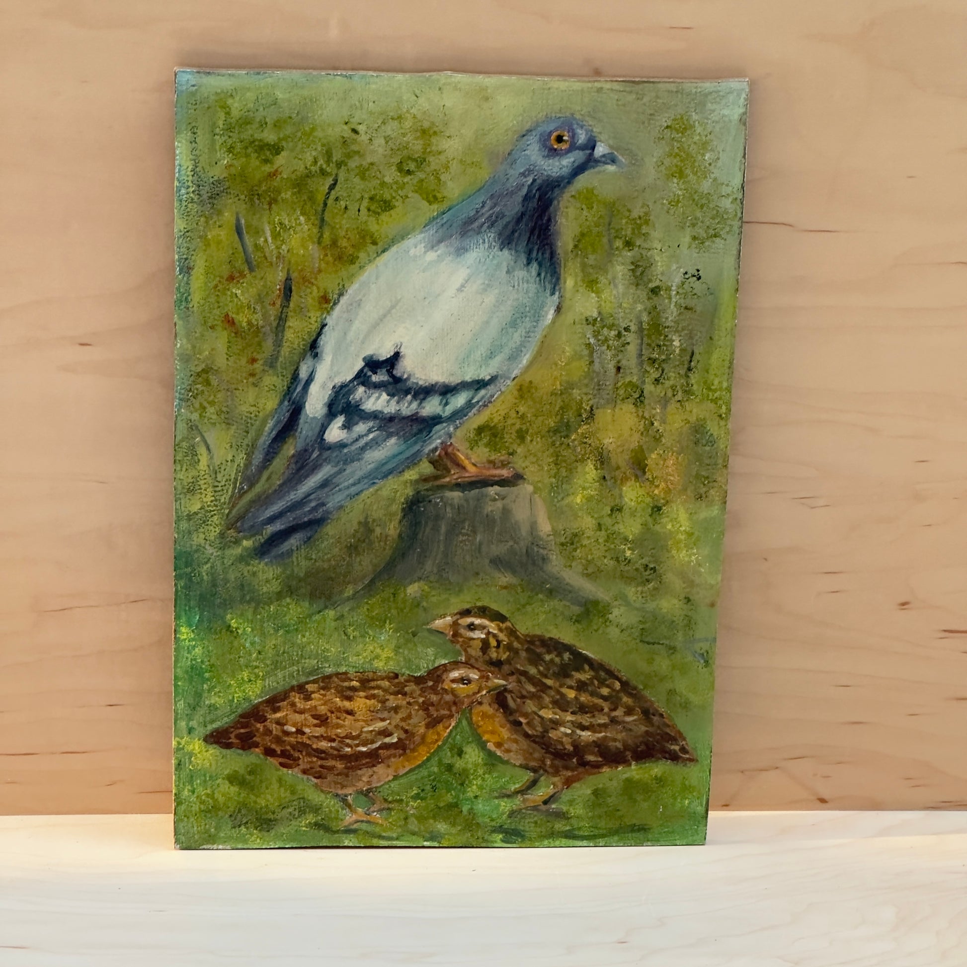 Charming vintage painting of a pigeon and 2 quail on a field of green. Unsigned. Oil on Masonite. 8.5” W x 12” T