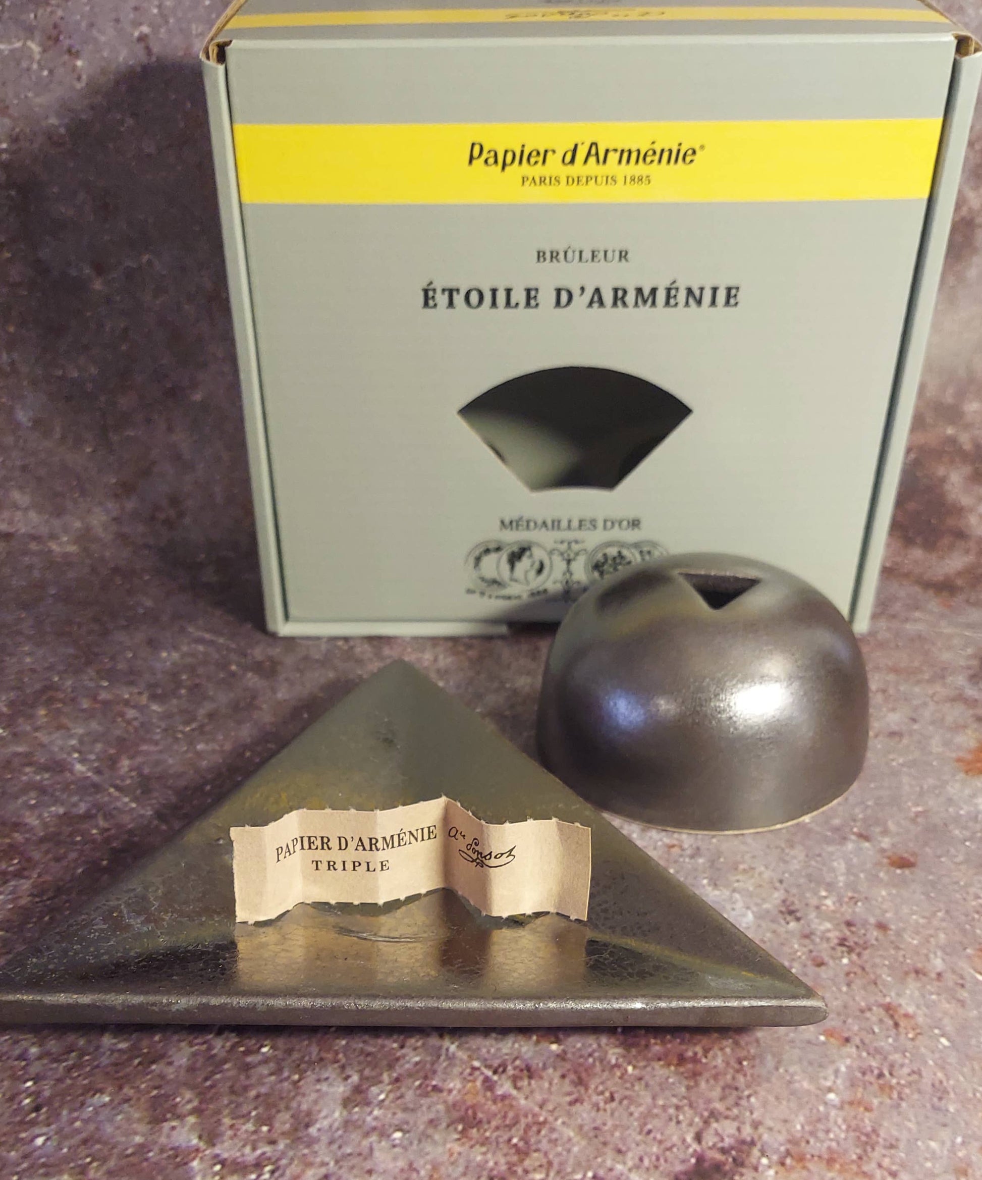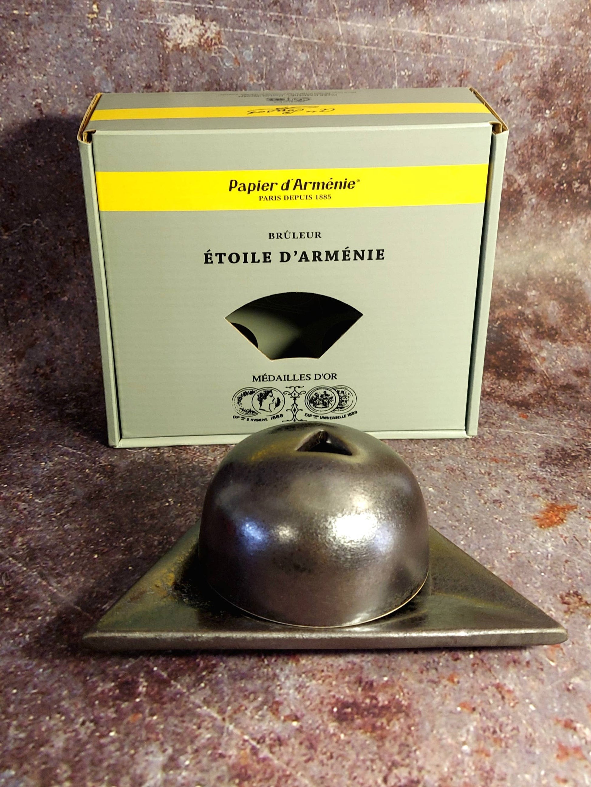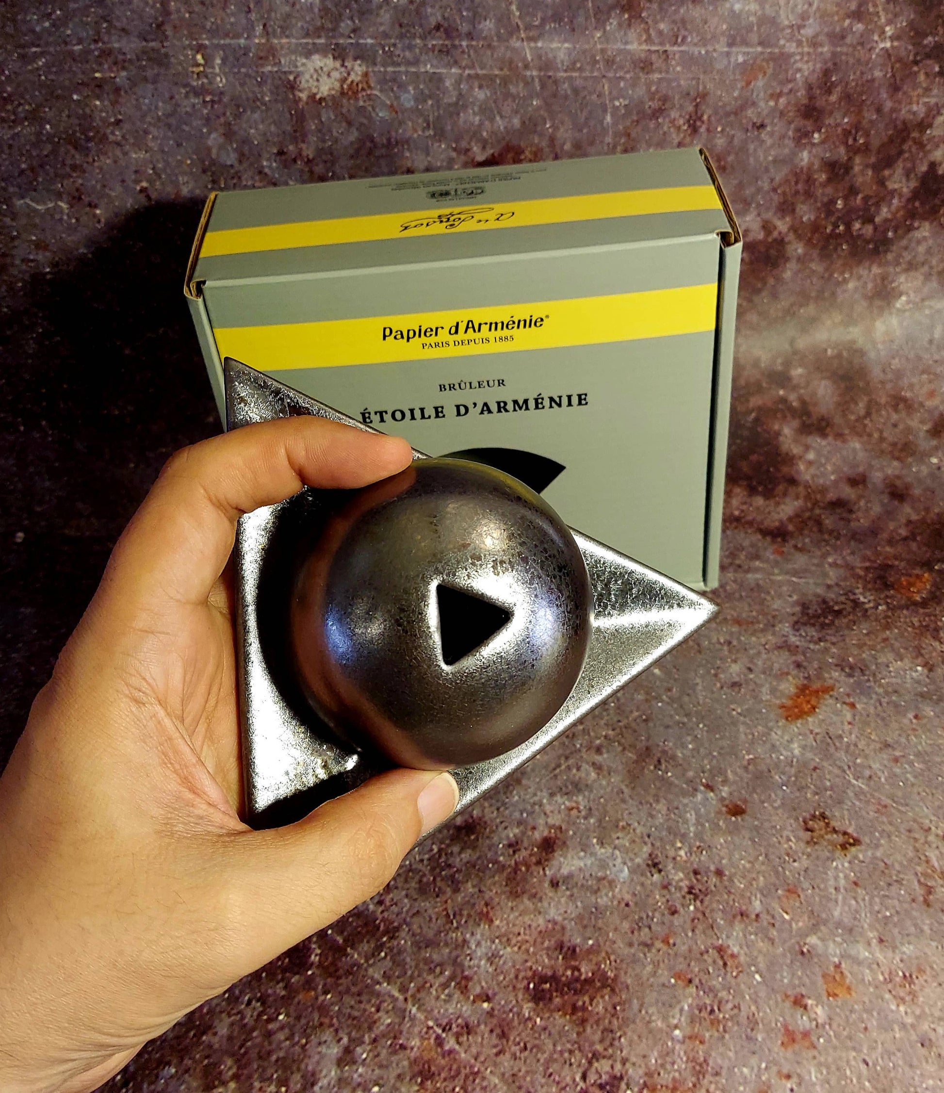 Papier D'Armenie Gray Ceramic incense burner holder for the home. A two-piece, gift-boxed incense holder of a triangular dish and dome in gunmetal silver gray / grey / gris. Modern yet timeless decor element.