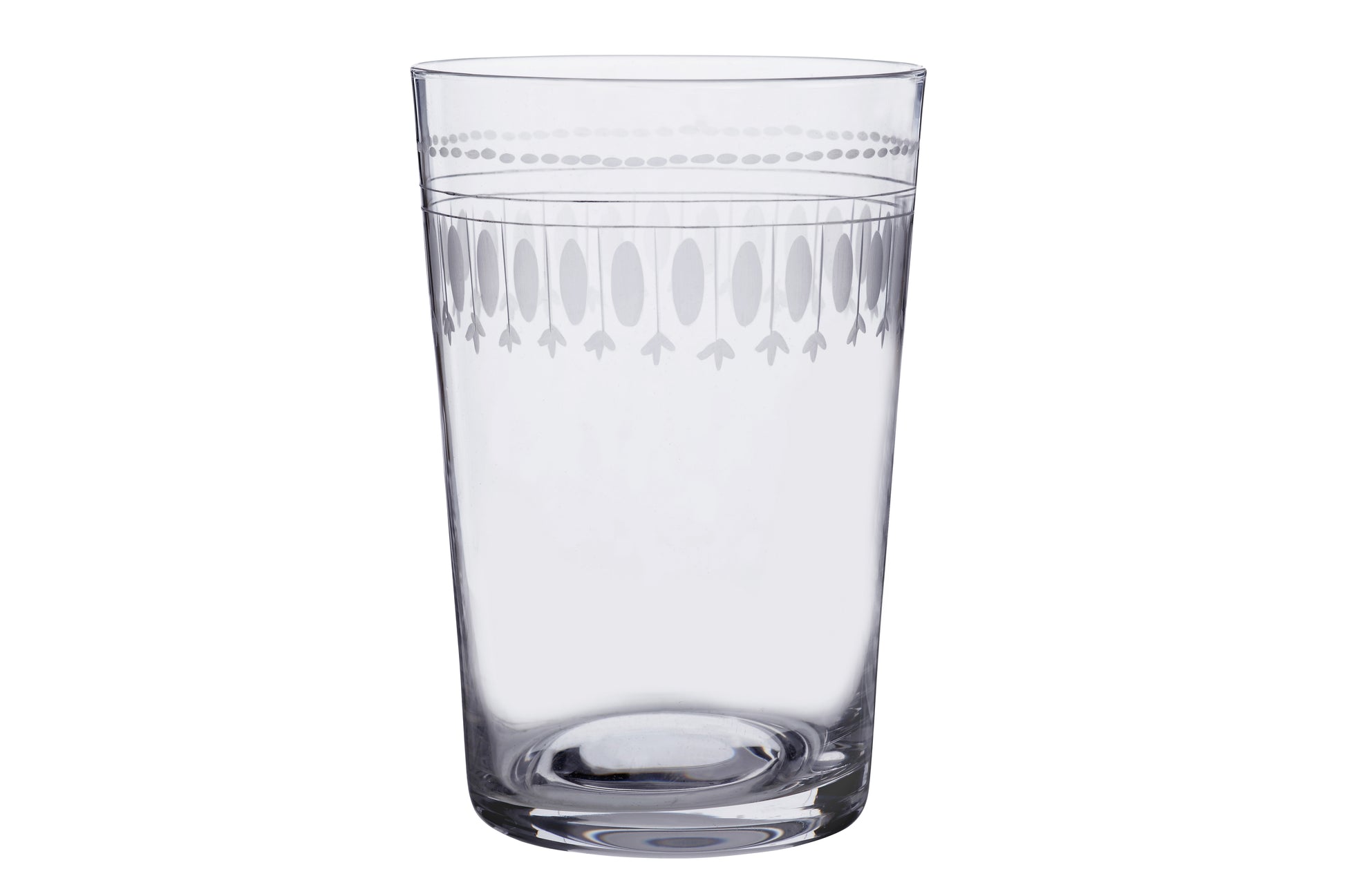 Crystal Tumblers with hand-etched oval design - set of six. 4.2"x 2.8", 8.8 oz capacity. Made in London by The Vintage List. Additional etching designs available.