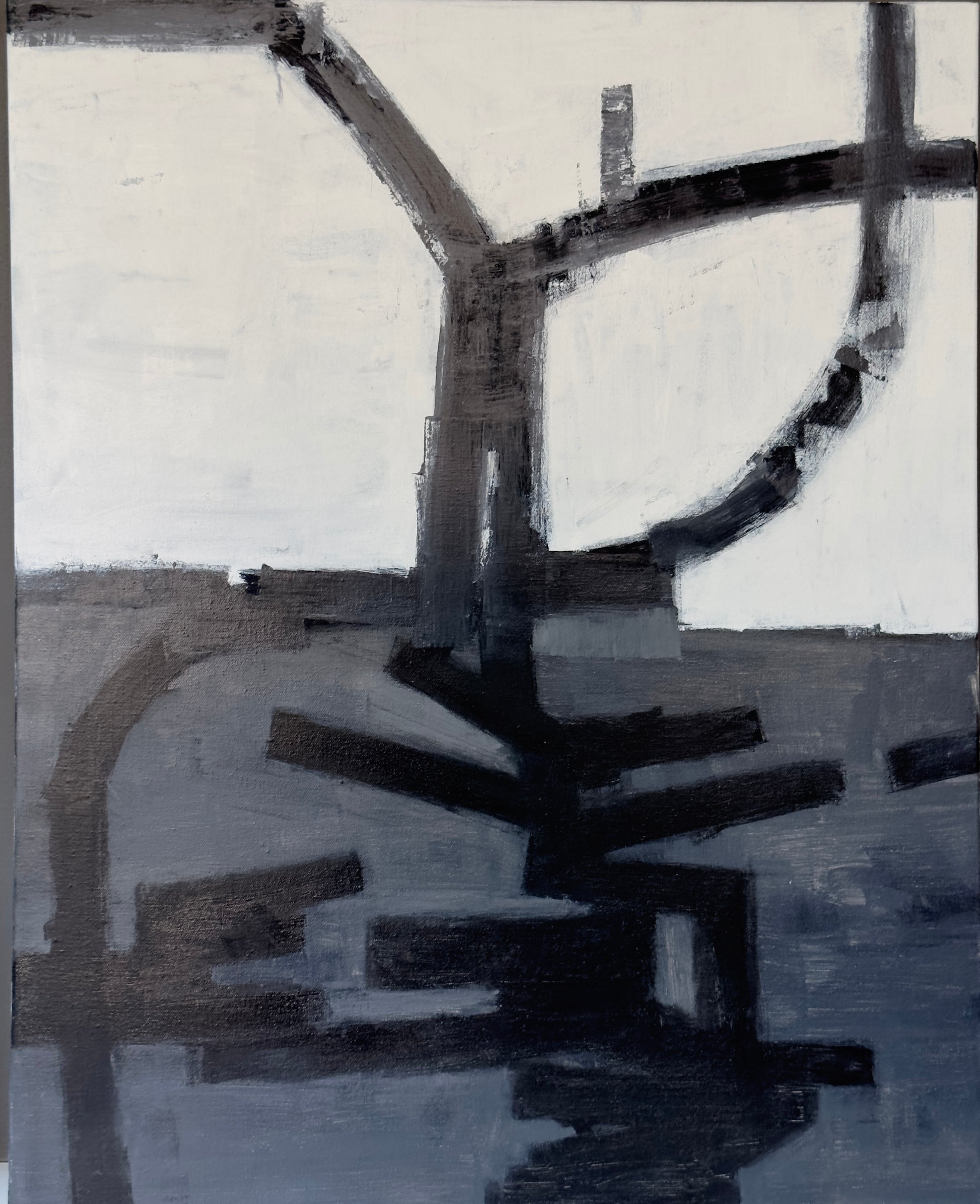 Untitled Oil on Canvas by Steven Miglio, 2013. 30"x24". Rendered in blacks, whites and grays, this energetic and striking composition could be the focus of a room.